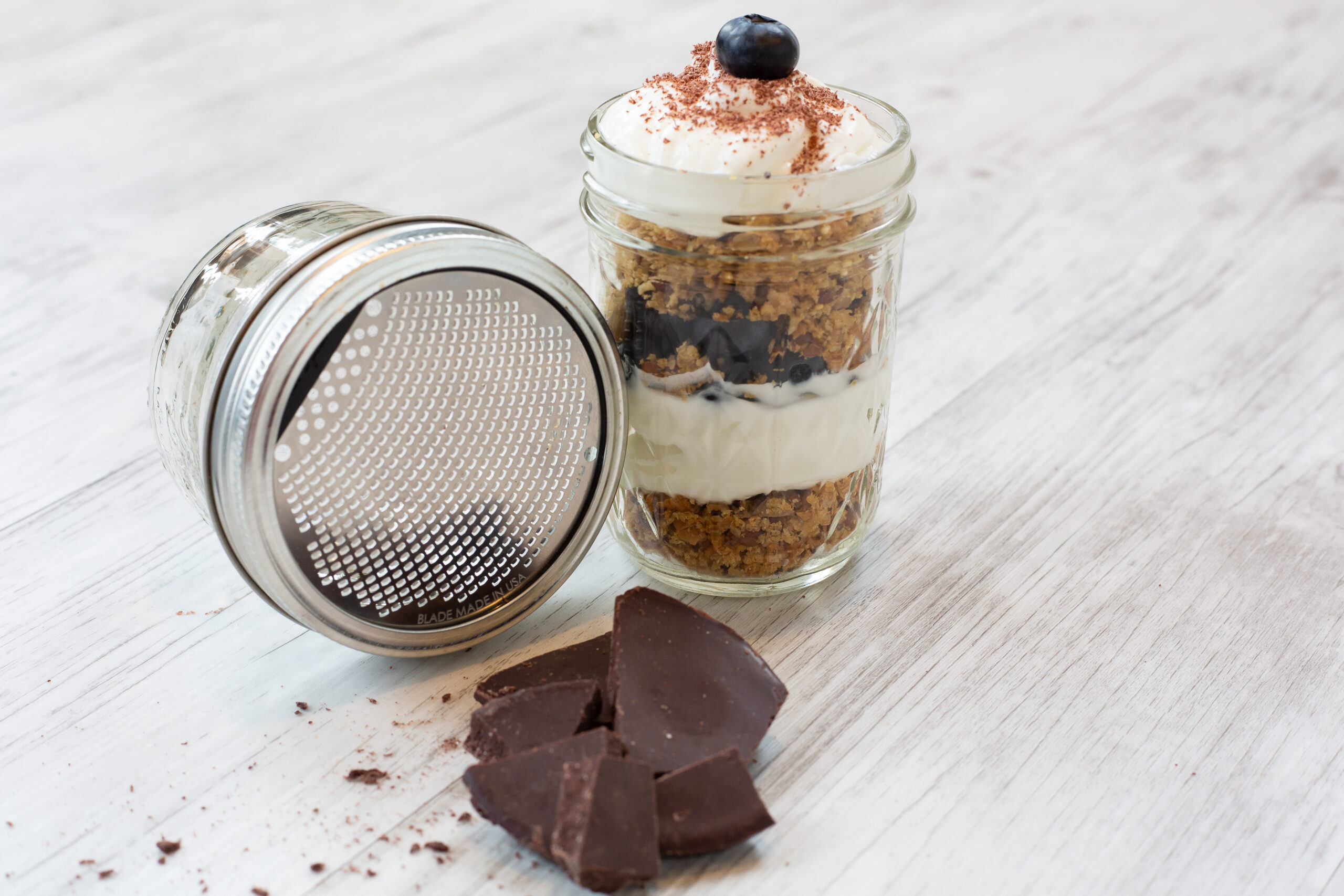 This two-piece grater set includes a fine blade and a durable ribbon blade lid that fit most wide-mouth canning jars. The fine blade was created for foods such as cinnamon sticks, whole nutmeg, citrus fruits and hard cheeses. The ribbon blade gives a textured result for foods such coconut, soft cheeses, carrots, potatoes and zucchini.