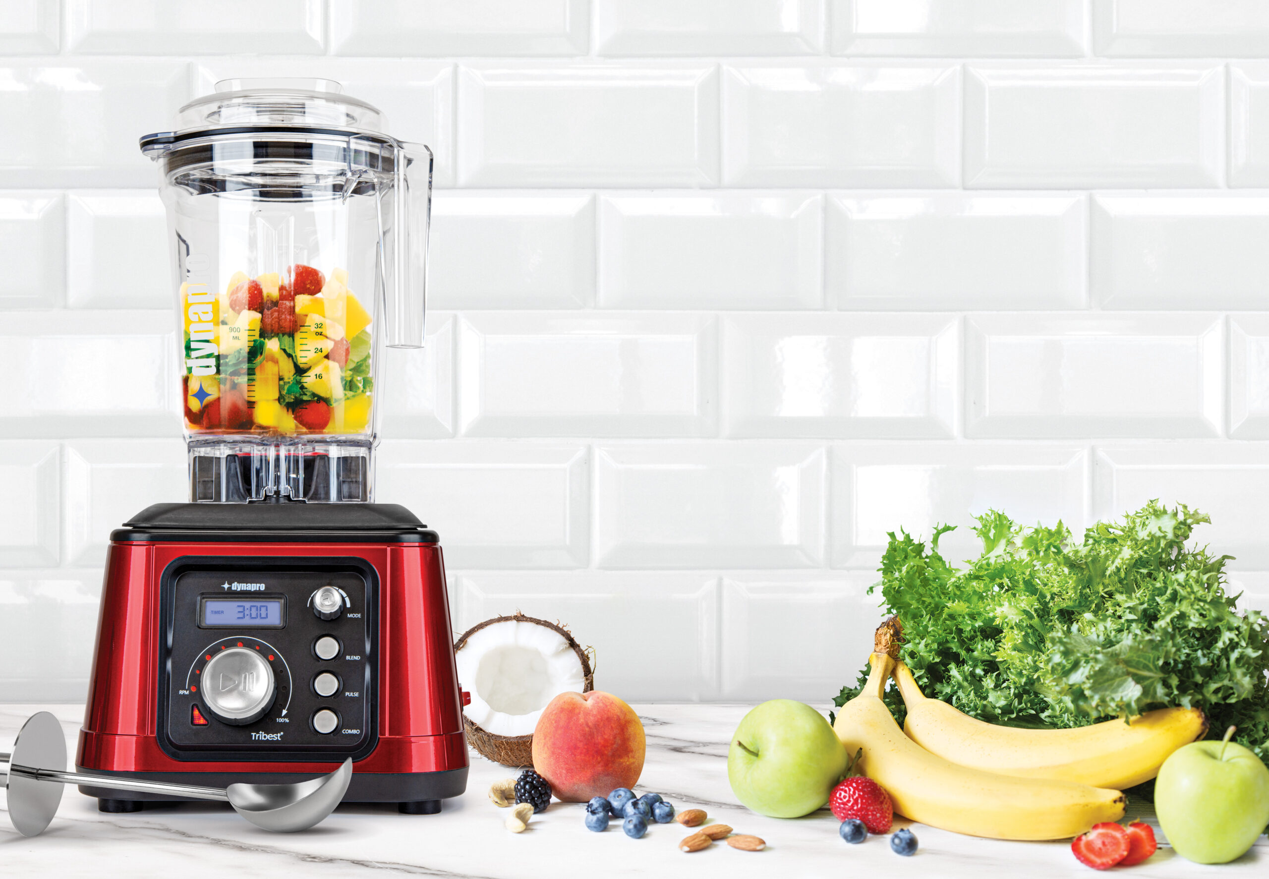 The 2.5 peak horsepower of the Dynapro High-Speed Blender blends at over 32,000 RPM. The blender was built to power through ice, frozen foods and tough whole food ingredients with smooth results. The One-Touch Vacuum Pump allows oxygen to be removed from the container before blending for a smoother texture.