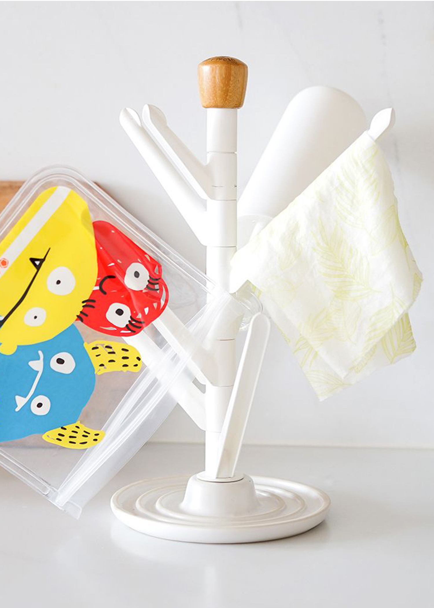 The Branch Out Upright Drying Rack was created to be a solution for awkward, hard-to-dry items that do not fit on many dish racks such as water bottles, dishcloths and reusable bags. The drying rack is designed optimize counter space by making use of vertical and horizontal space.